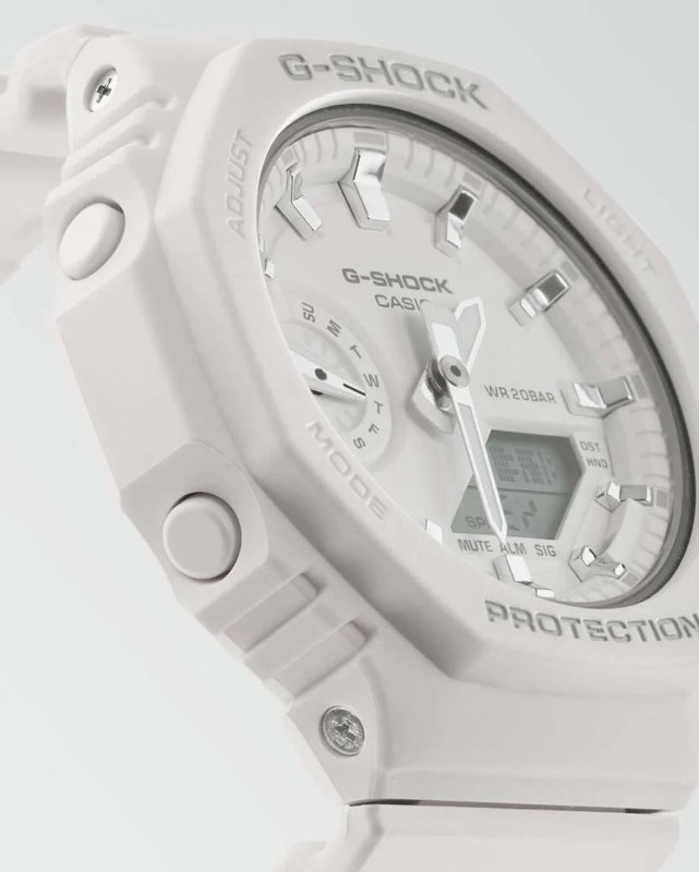 La Gshock GMA-S2100-7AER est blanche avec des indexs couleur argent.