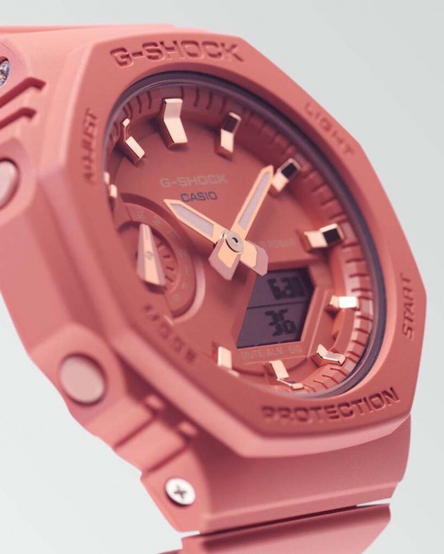 La Gshock GMA-S2100-4AER est rose pâle avec les indexs rosés.